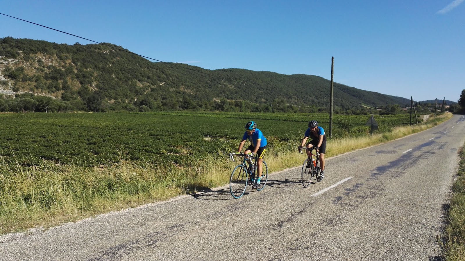 | Sur la D558, entre Villeneuve-de-Berg et Lagorce, le plaisir de pédaler en duo. |